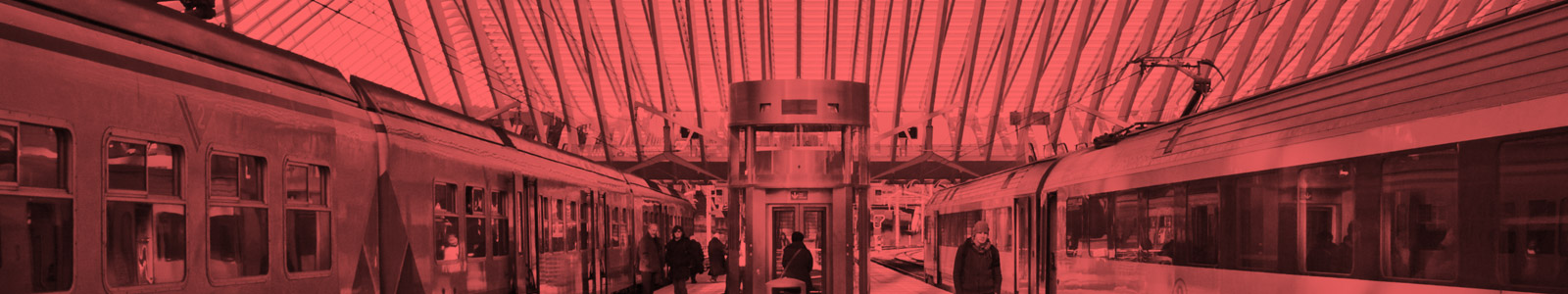 A red toned photo of people waiting at the train station.